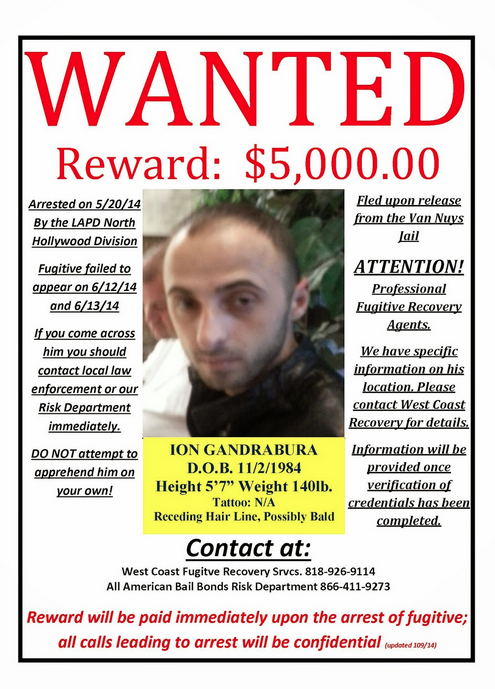 If you have any information of the whereabouts of Gandrabura or Paladi, contact West Coast Fugitive Recovery Services at 818-926-9114 or the All American Bail Bonds in Santa Clarita Risk Department at 866-411-9273. Tips and information will be confidential.